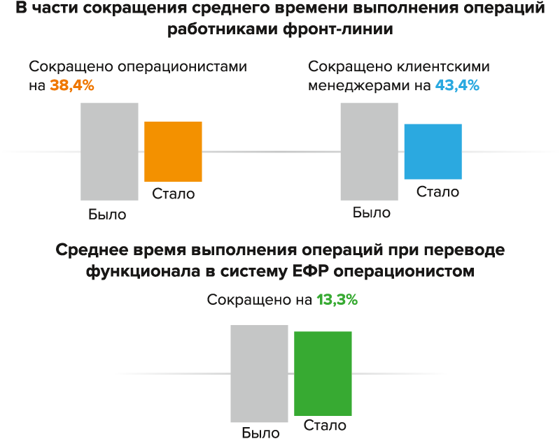 Единственный продукт, который мы пока не перевели в единое фронт-офисное решение, это ипотека. Он уже реализован на тестовом контуре, а в октябре текущего года мы начинаем его опытную эксплуатацию в рамках нашей сети. Ипотека — это очень сложный продукт, поэтому он будет переведен в ЕФР последним. В результате внедрения проекта мы получим в рамках единого фронт-офисного решения 85% операций, которые делает сотрудник. Остальные 15% приходятся на редкие продукты и операции. Например, это страховые продукты компаний, не входящих в группу РСХБ, денежные переводы, которые оформляются вне рамок продуктов банка. Ключевые для нас 85% — это единый основной массив операций, который будет проходить внутри фронтального решения.