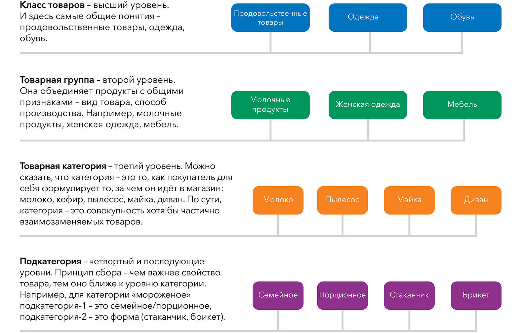 - Товарная категория — третий уровень. Можно сказать, что категория — это то, как покупатель для себя формулирует то, за чем он идёт в магазин: молоко, кефир, пылесос, майка, диван. По сути, категория — это совокупность хотя бы частично взаимозаменяемых товаров.