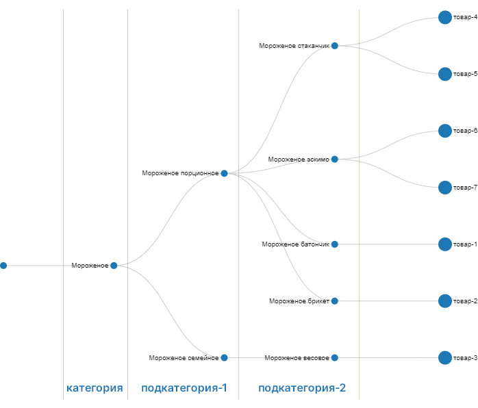 - Подкатегория — четвертый и последующие уровни. Принцип сбора — чем важнее свойство товара, тем оно ближе к уровню категории. Например, для категории «мороженое» подкатегория-1 — это семейное/порционное, подкатегория-2 — это форма (стаканчик, брикет).